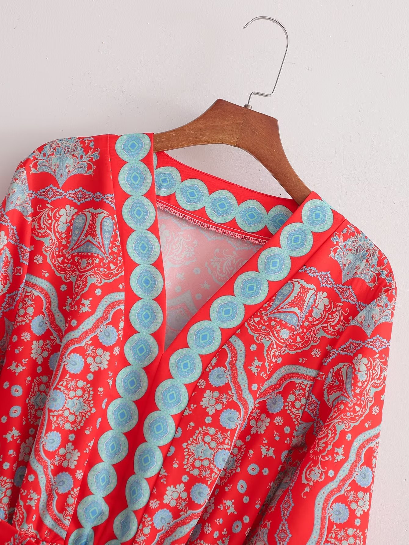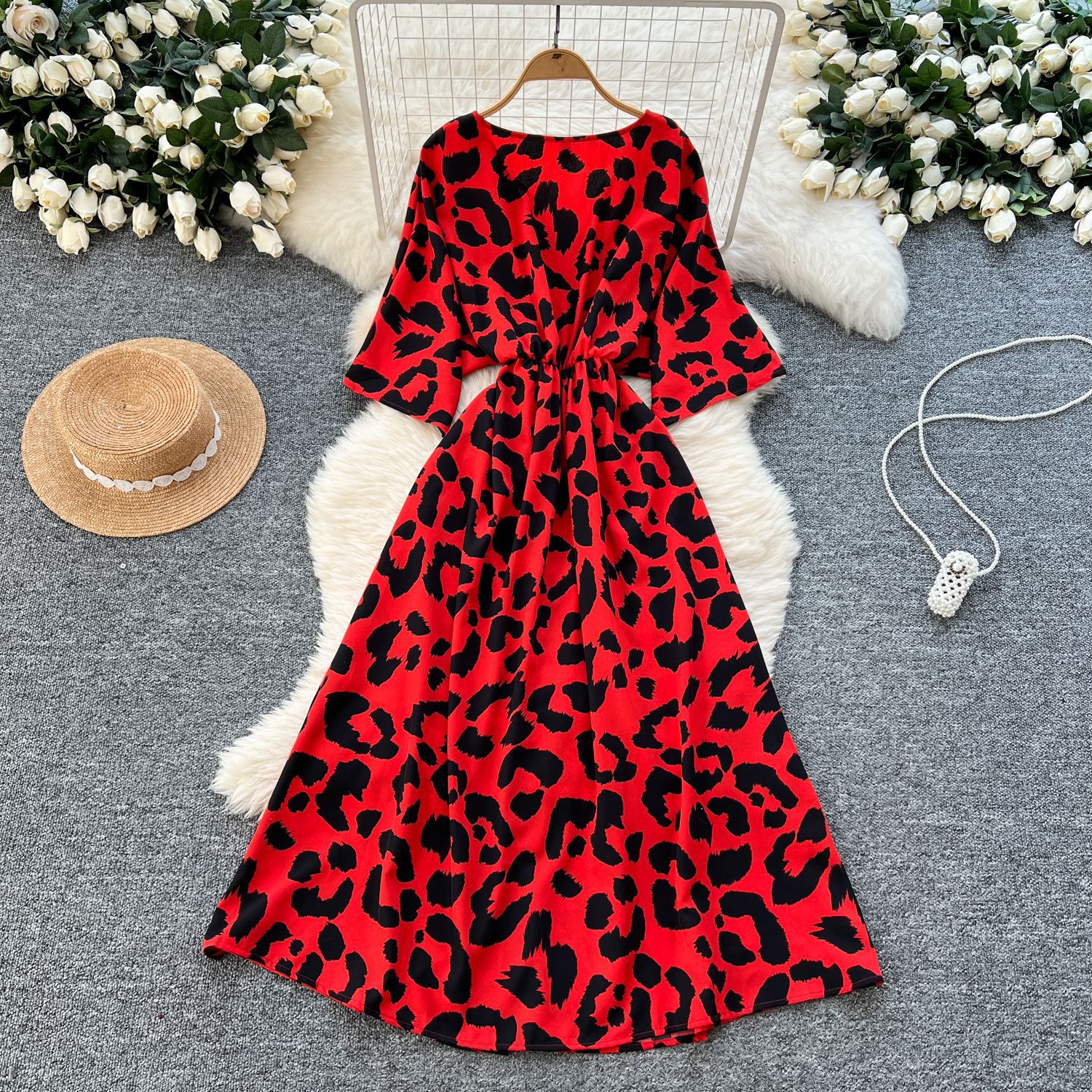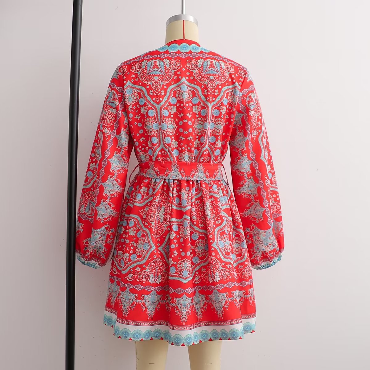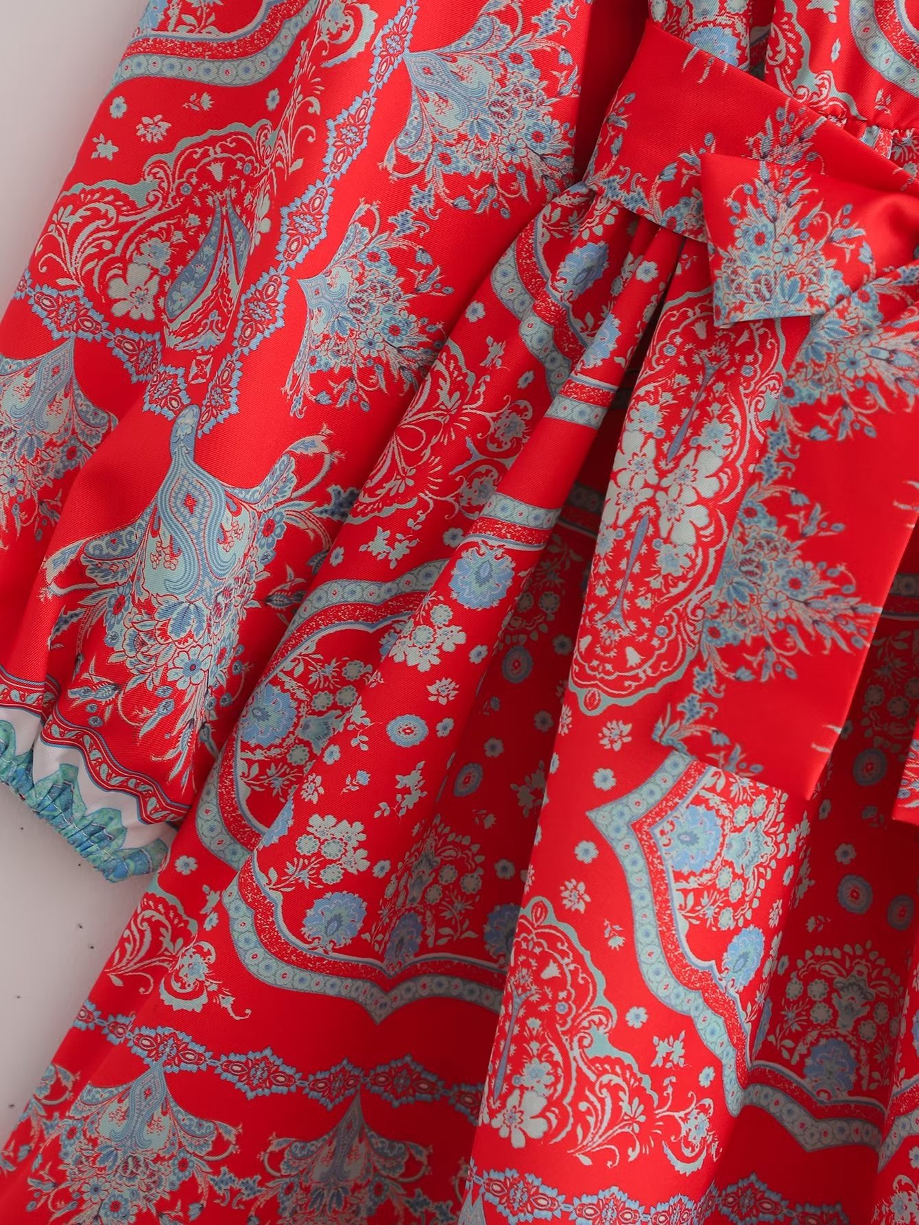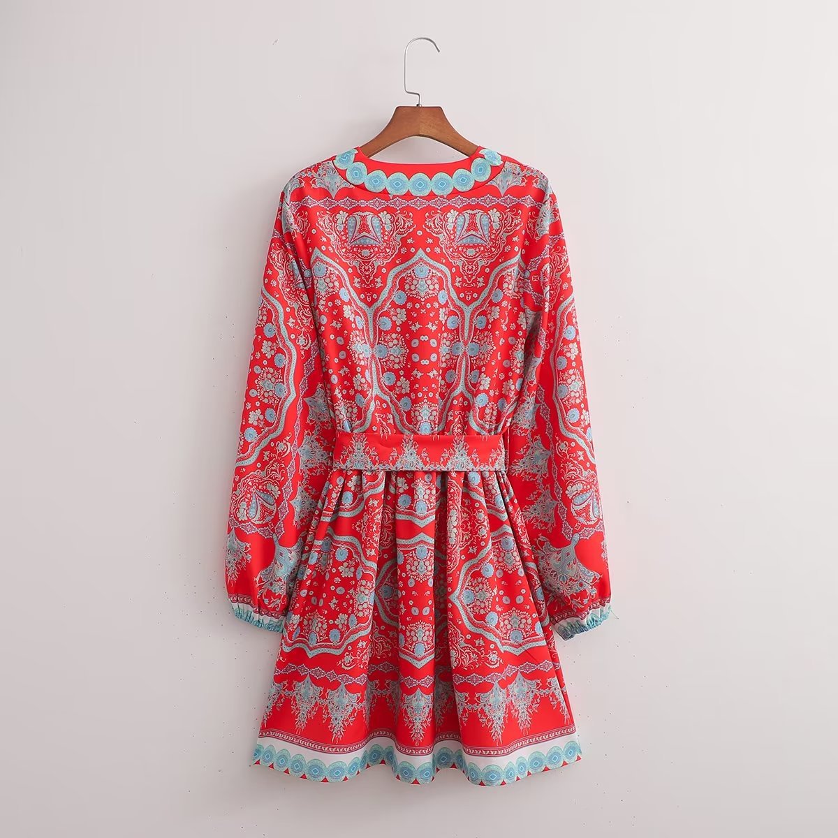 Women’s Long Sleeve Red Floral Dress – Elegant European Style