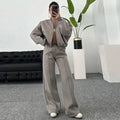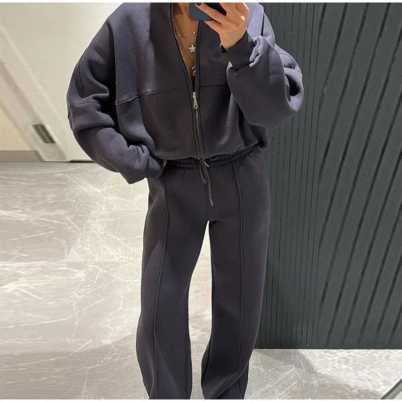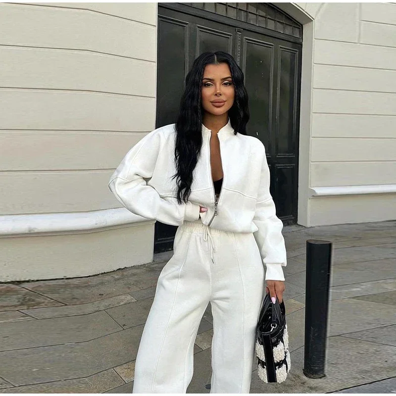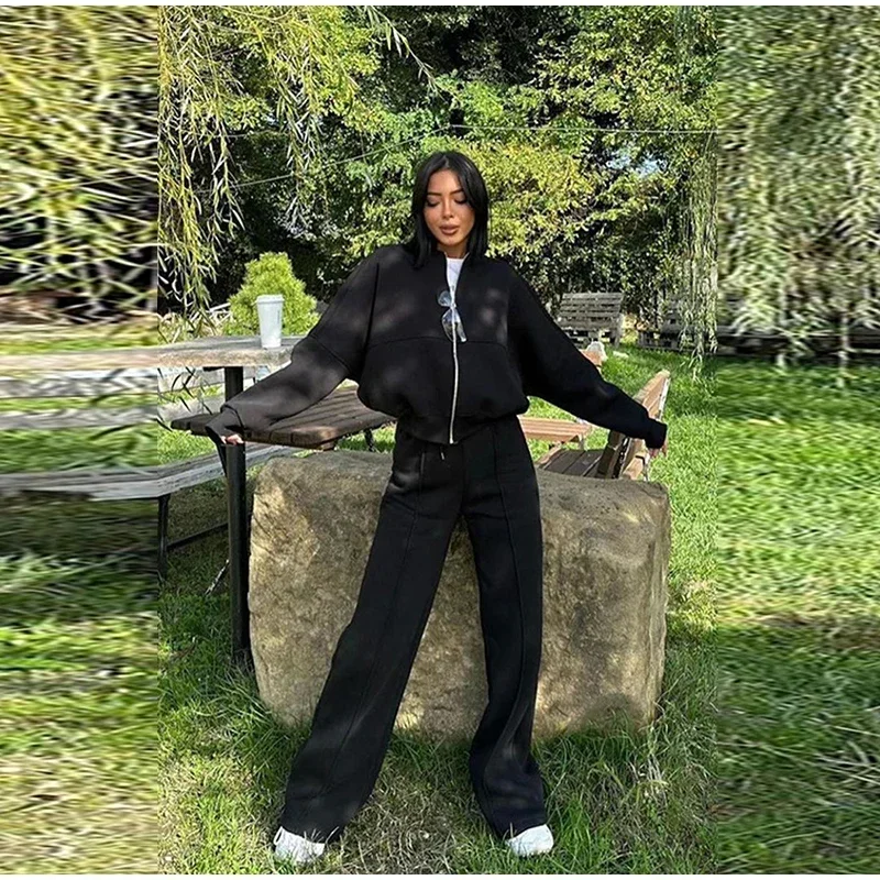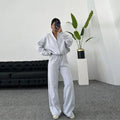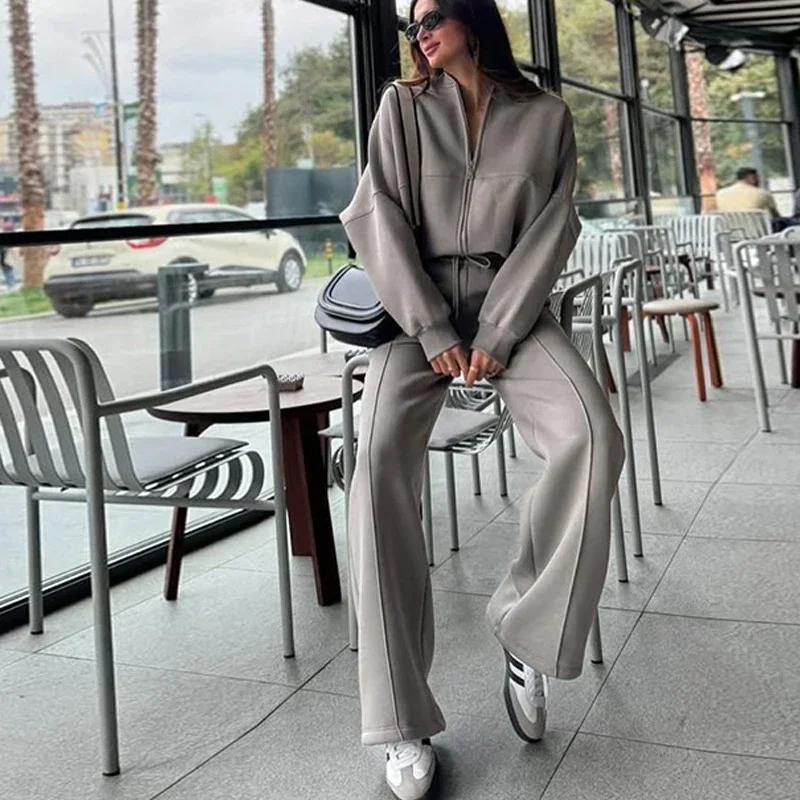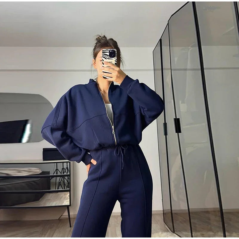 Women Casual Sweatshirt Pants Set Spring Autumn Zippers O-neck Jacket Loose Lace-up Elastic Waist Trousers Suits Solid Outwear